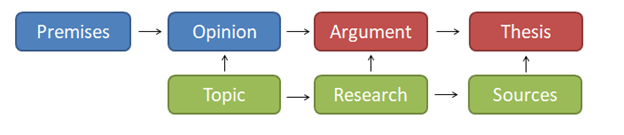 So here is my basic model. The next bunch of posts will be me explaining it, and how to apply it to historical writing. I will point out that this is developed first and foremost for history, but it works fairly well, with minor modifications, for other fields that require you to write more than five pages. Some of my explanations of each component run rather long, but the intent is to have a model that can be grasped and applied in a relatively short amount of time.